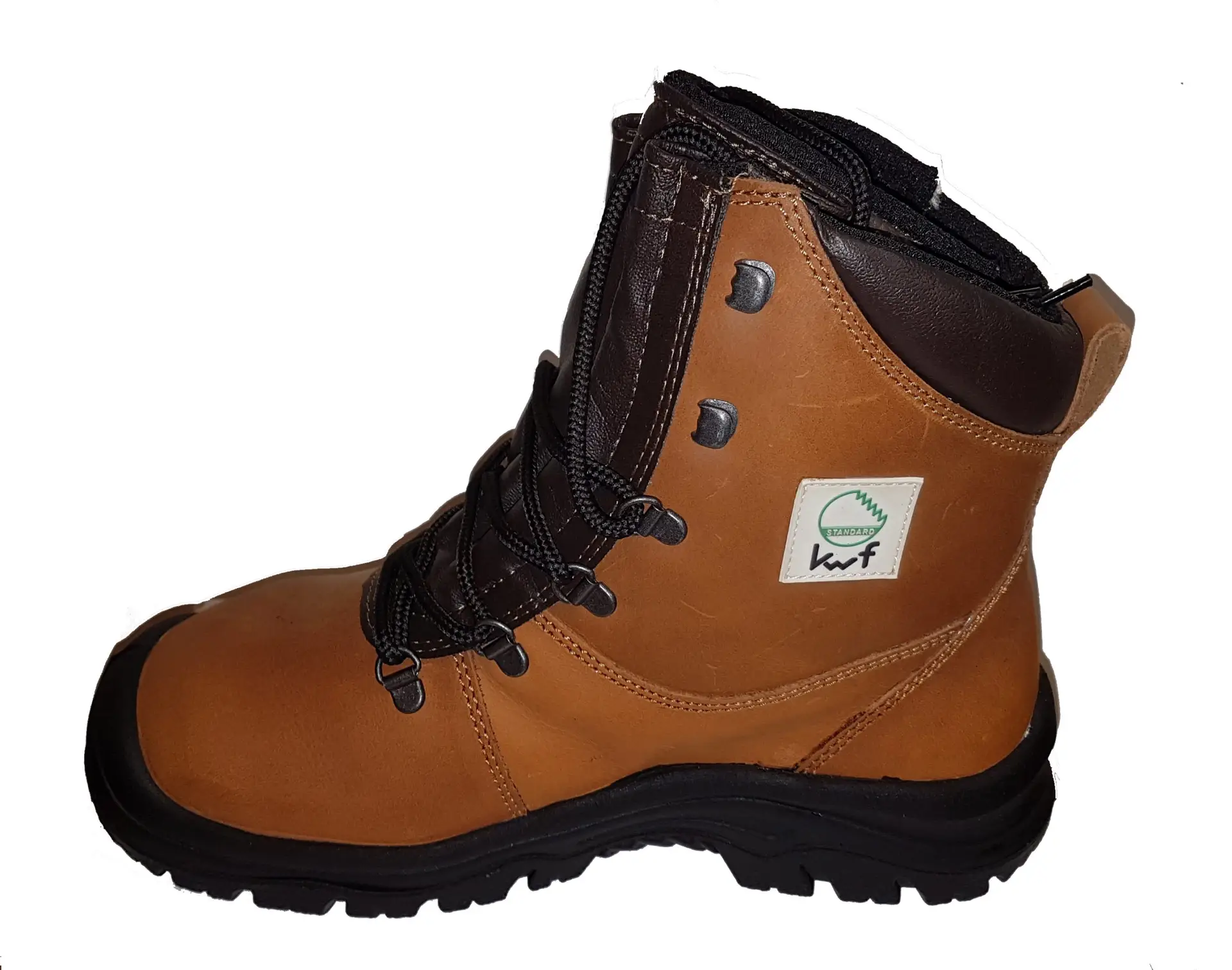 Topkwaliteit in ons assortiment: een vol lederen zaagschoen hoog model. Zaagklasse 2, stalen zool, stalen neus, KWF-gekeurd, voldoet aan alle gangbare normen. Maat 39-47.